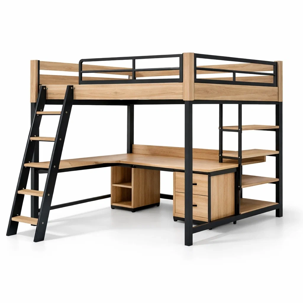 Lit mezzanine en bois et métal avec bureau intégré