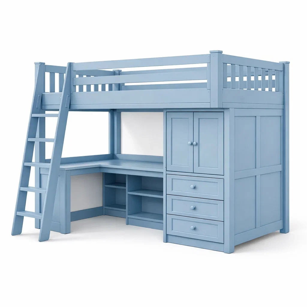 Lit mezzanine en bois bleu avec bureau et rangement