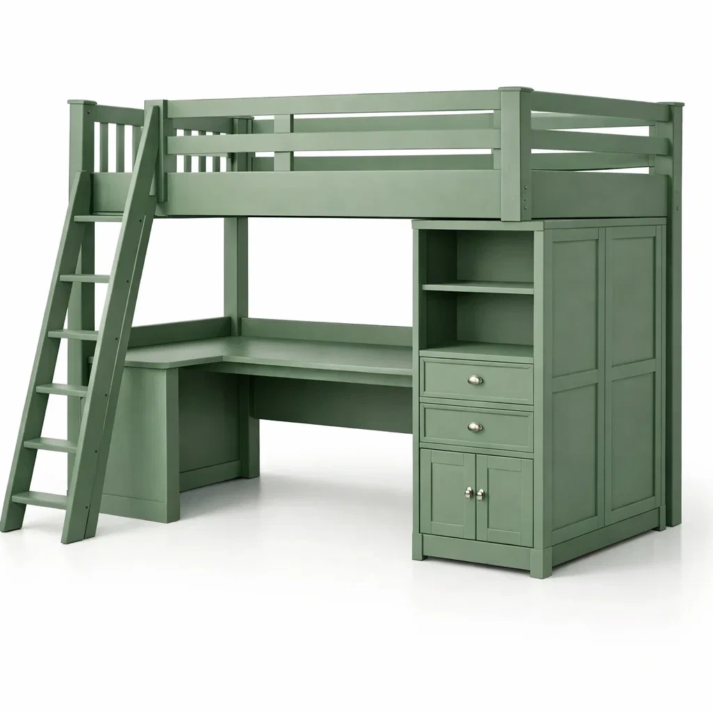 Lit mezzanine en bois avec bureau et rangement intégrés vert
