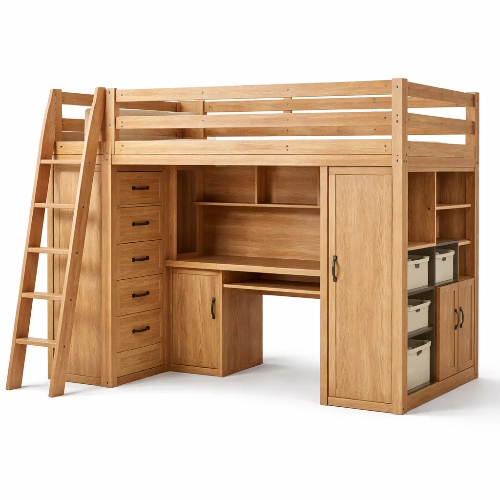 Lit mezzanine en bois de chêne avec bureau et rangement marron